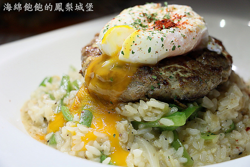 使用牛豬混合漢堡排,上面加了半熟蛋