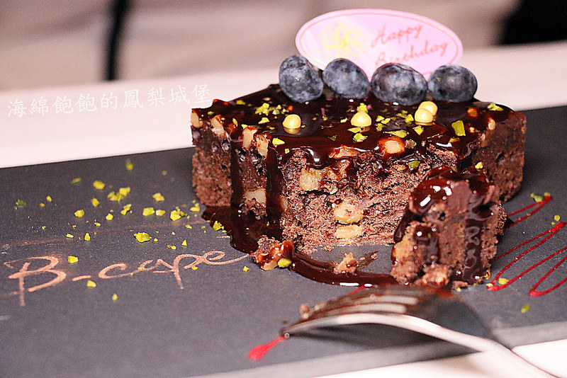 於用完甜點後送上,布朗尼蛋糕搭配精緻擺盤