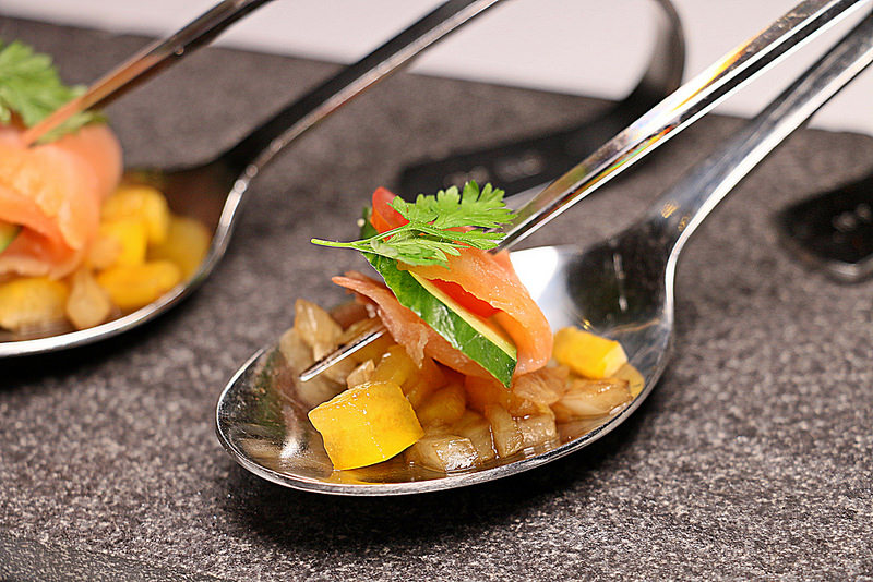 醃漬洋蔥末鋪底,放上鮮蔬鮭魚串