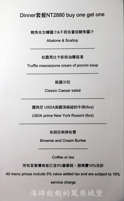 (套餐含前菜、湯品、沙拉、甜點、飲料)