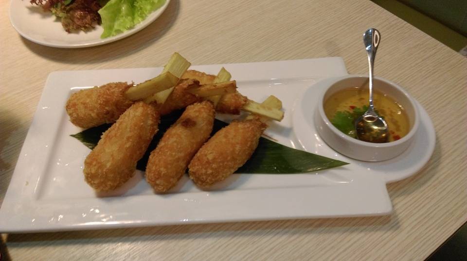 著烤過的甘蔗條炸過而來,甚至可以包著生菜一塊沾醬