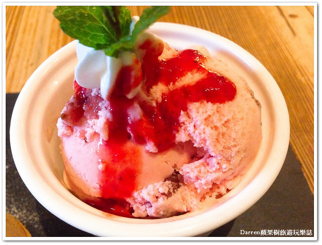 旁邊的草莓冰淇淋也不馬虎,吃起來濃郁不會感覺水水的,搭配鬆餅一起吃有加分到