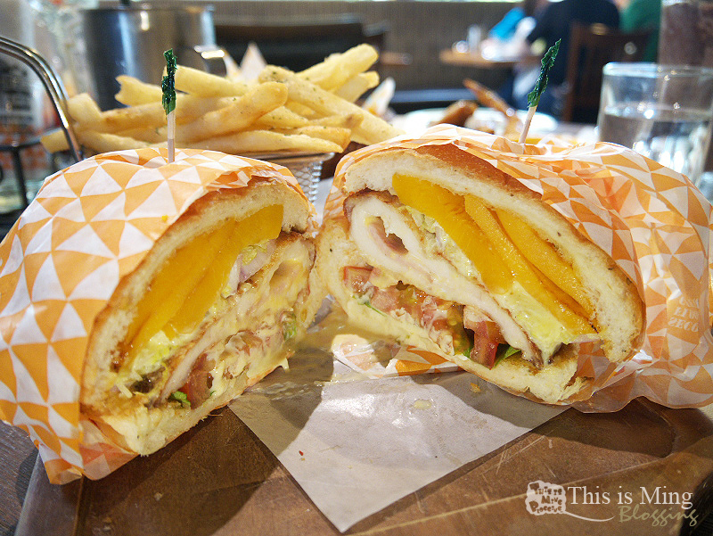來了來了,水蜜桃片、藍帶豬排、番茄生菜等層層堆疊在堡中,井然有序,十分漂亮。