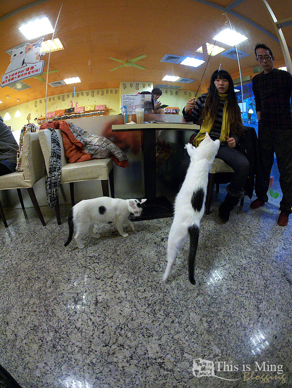 店裡一位女孩正拿著小釣竿跟貓咪玩兒著。