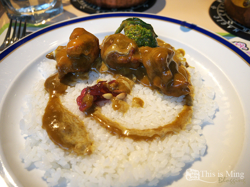 我選的唐揚椰香雞肉咖哩(單點NT.198元)一上桌就很吸睛,黃褐色的咖哩醬汁淋上了白色的椰奶,混有椰香與咖哩香的氣味冉冉而上。