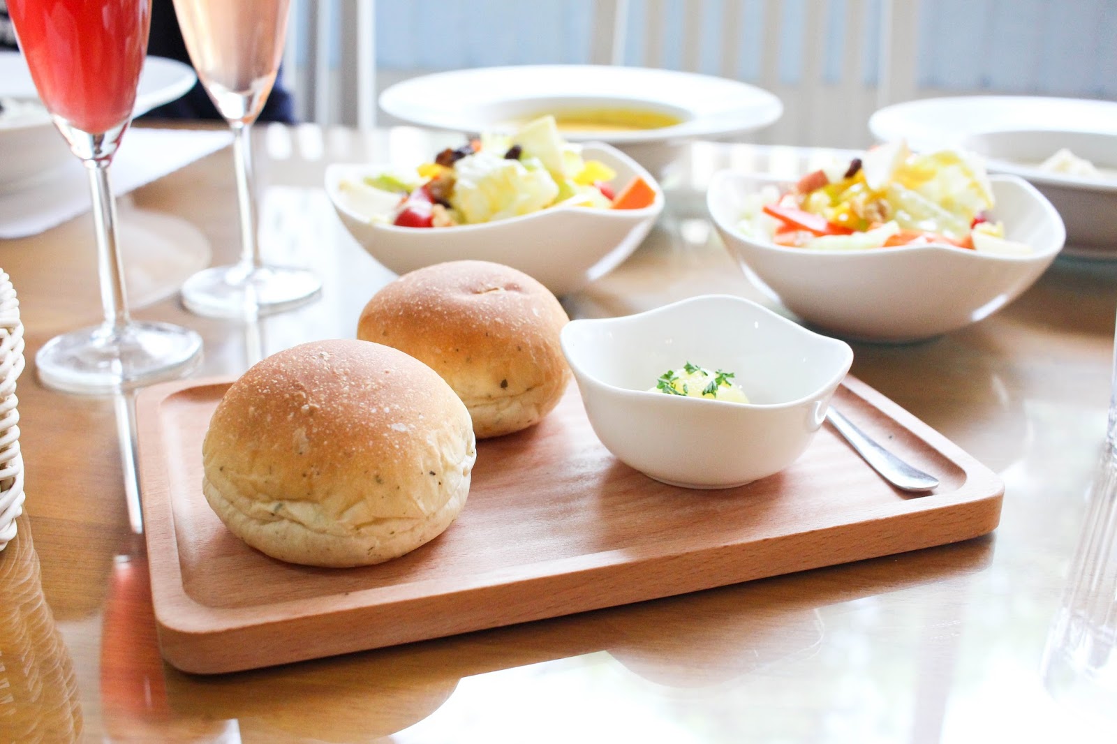 木板上放了兩個鬆軟的雜糧麵包,沾了些許奶油塗抹在麵包之中。
