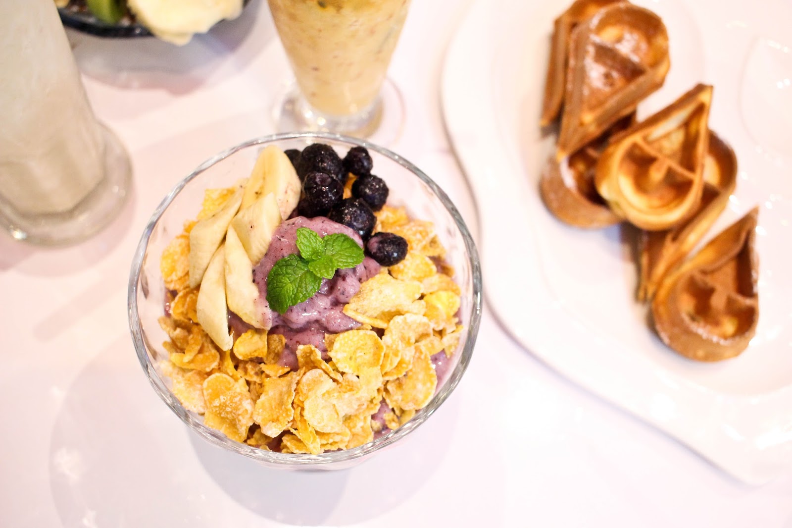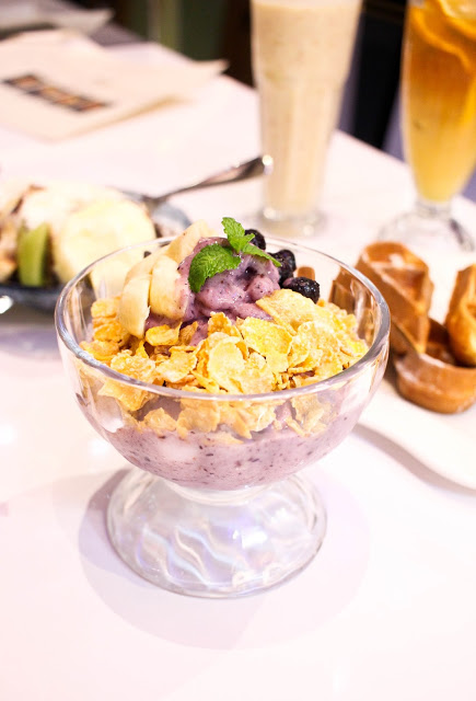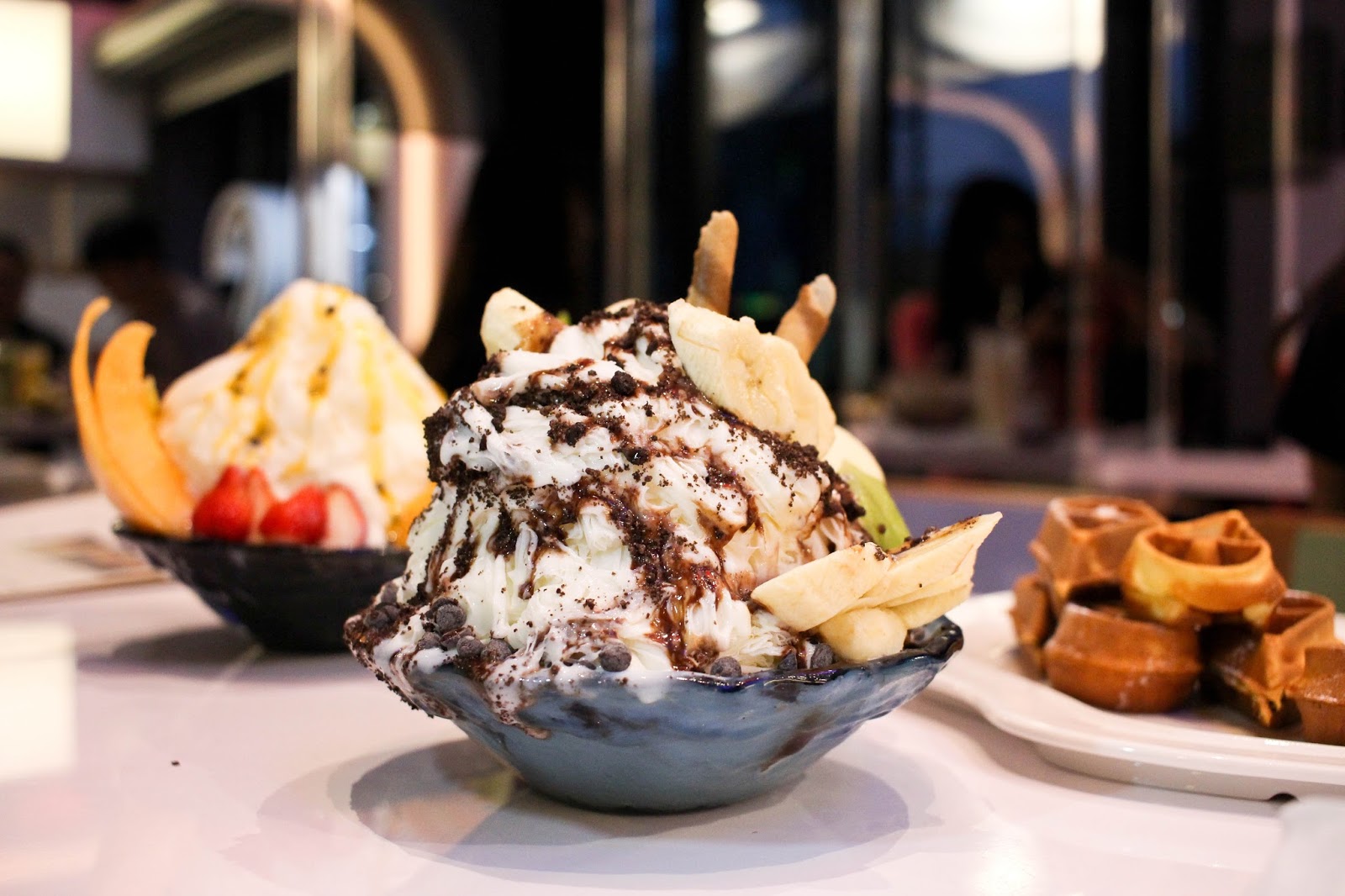牛奶冰磚灑上巧克力粉以黃色香蕉點綴,巧克力粉如oreo的口感。