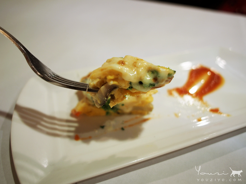 灑上些許香料的烘蛋 ,包裹著花椰菜、馬鈴薯、香菇…等蔬菜,不用沾一旁的蕃茄醬就很好吃。