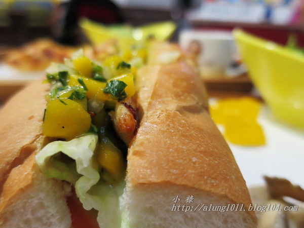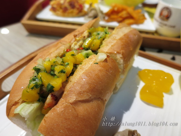 超推的夏季美味輕食~ 札實的熱狗堡麵包,內裡滿滿包著芒果丁、生菜、雞胸肉、莎莎醬。