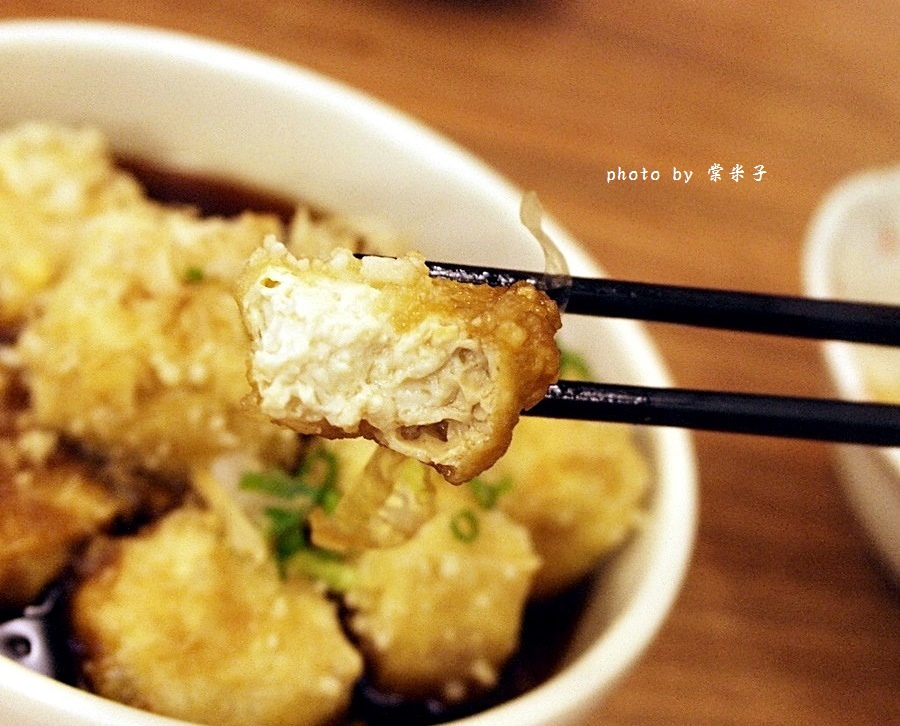 微酥中帶著濕潤感的炸豆腐口感細緻滑嫩,味道甜中帶鹹,