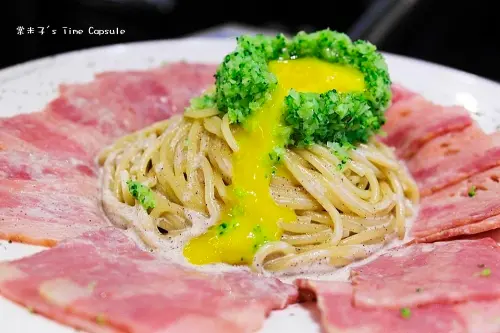 第一道上桌的主餐是「招牌灰醬香料培根蔬菜義大利麵 」,Doris會先送上擺盤好的樣子給我們欣賞,被滿滿培根包圍的義大利麵,上面還有青花菜末捧著一位蛋黃哥,看起來就好美味,視覺也是享受美食的一大樂事呢!