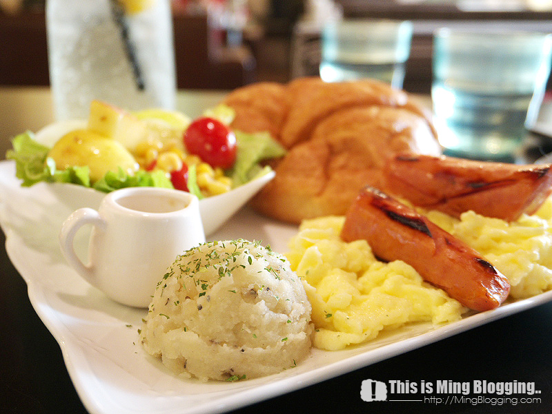 我點的法式可頌早餐(NT.170)與水蜜桃果漾(NT.90)上桌了,如果在台北市區這樣環境的店面點這樣的內容,我想一定更貴哩!可頌、炒蛋、煙燻香腸、生菜、馬鈴薯泥,感覺營養很均衡的一份brunch。