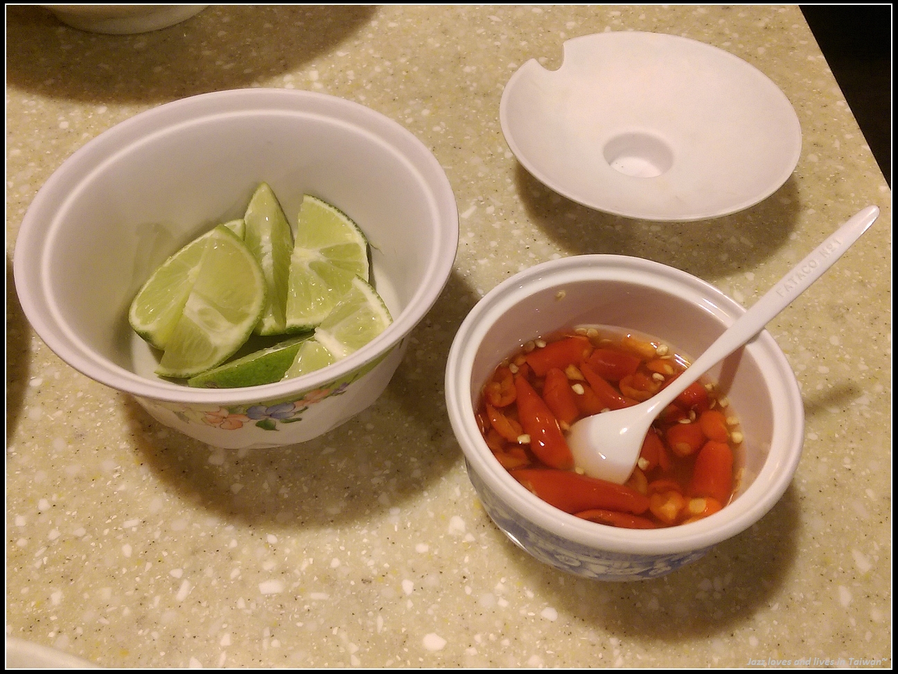點完餐後再請店家再來一碗檸檬片和泡椒魚露, 泡椒魚露辣勁很強, 尤其是尾勁, 別一口氣淋太多, 像我就過辣, 吃到滿頭大汗,