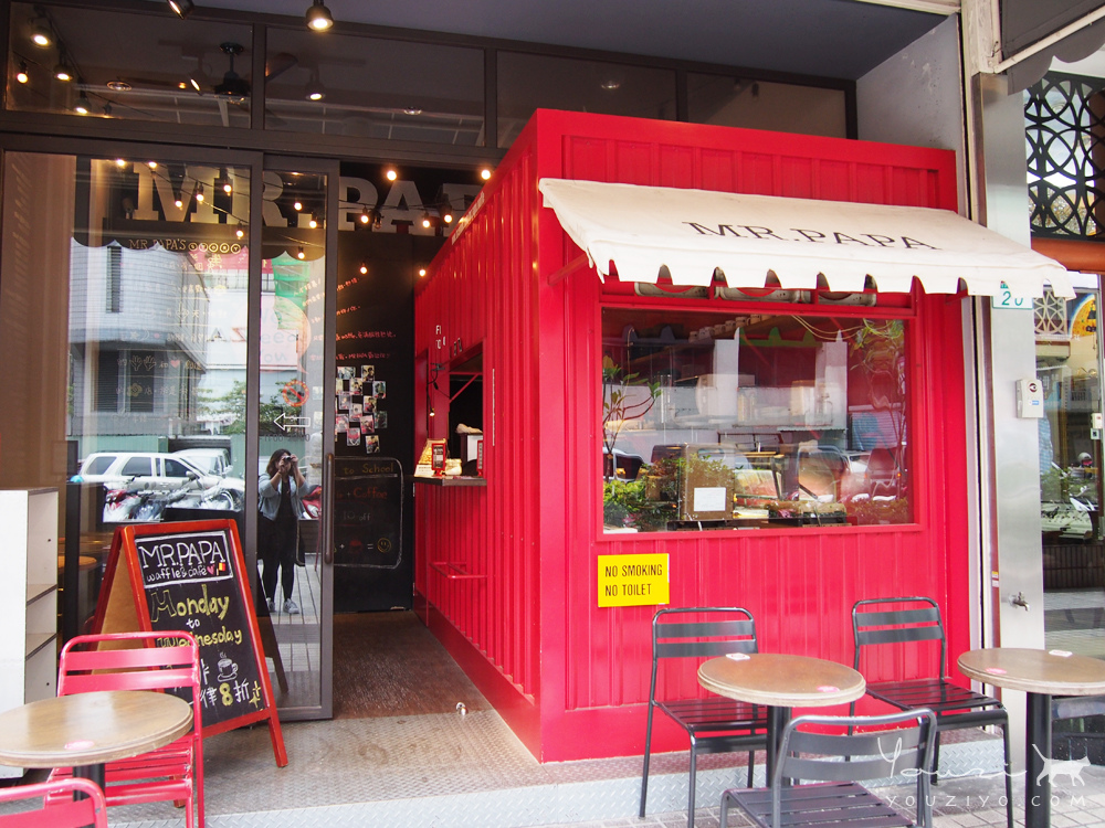 MR.PAPA WAFFLE&CAFE 比利時鬆餅專賣店非常顯眼,轉進UNIQLO明曜店和Forever 21間的巷子,就能看到外頭這幾座露天咖啡座,這日微涼的天氣還蠻舒服的,不少人選擇外頭的座位。