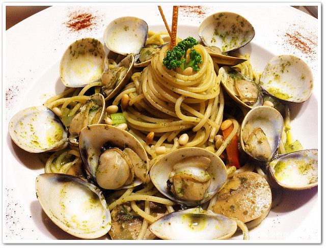 青醬松子蛤蜊義大利麵,個人覺得蛤蜊是亮點,超大的蛤蜊肉質飽滿Q彈多汁很好吃