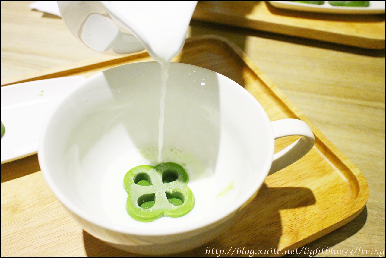 很特別的北海道牛奶,最被推薦的是搭配法國巧克力的贅沢牛奶巧克力,跟日本福岡八女抹茶的贅沢牛奶抹茶,因為都是作成四葉造型的樣子,上桌後自己加入牛奶享用,很是特別