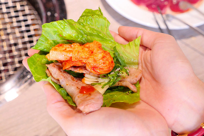 然後用生菜包著吃(一樣附上韓式必備的生菜、蒜片、辣醬),只有2480元和牛套餐沒有它!