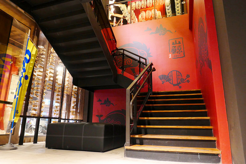 木作的樓梯滿滿日式風情,紅色為底的漆裝牆面寫滿了文字,往上抬頭可以看到滿滿燈籠,