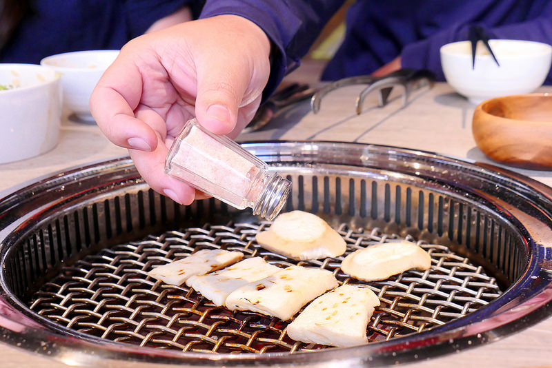 新鮮的杏鮑菇切片後,烙烤完直接灑上玫瑰鹽,帶有滿滿多汁的甜味跟Q脆口感,