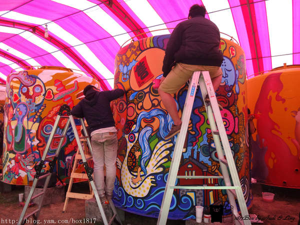 大家看到漂亮的彩繪酒桶,是經過多位藝術家辛苦的成果,