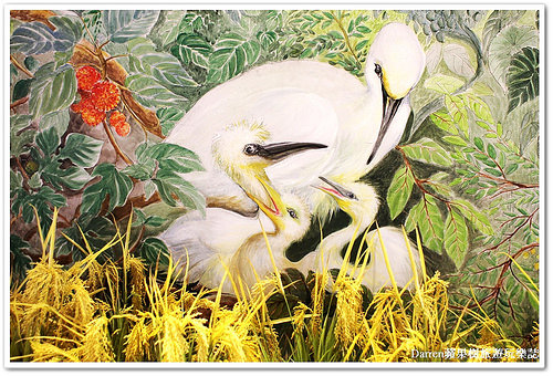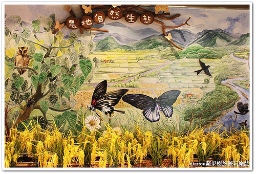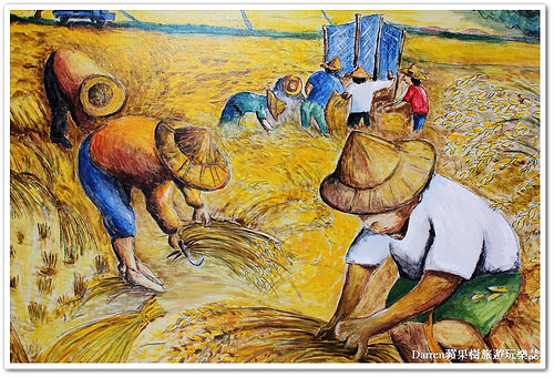 這幅壁畫也是鄉村農家的景象,前面的稻米是前景把農地的自然生態展出在壁畫上