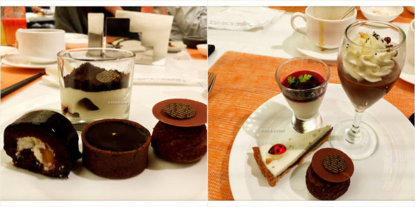 (左)提拉米蘇、火山豆巧克力蛋糕捲、法芙娜70%巧克力塔、酥皮可可泡芙