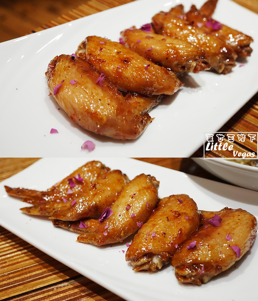 一盤約5隻雞翅,廚師在上面灑上玫瑰花辮,看起來多了些英式優雅