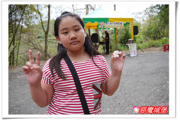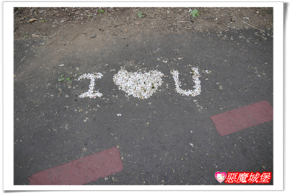 某路段的油桐花樹比較集中,地上掉了好多花朵,許多遊客都在這裡撿花,還有人排了「I O U」字樣,Fiona也開心的跟著找尋喜愛的小花~~