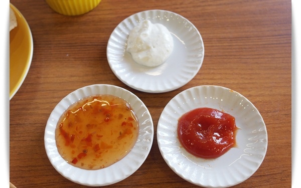 準備沾炸物的醬料們,塔塔醬、泰式酸辣醬及番茄醬。
