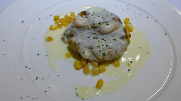 圓餅狀的馬里蘭蟹餅淋上濃稠白醬,佐以香甜的玉米粒,