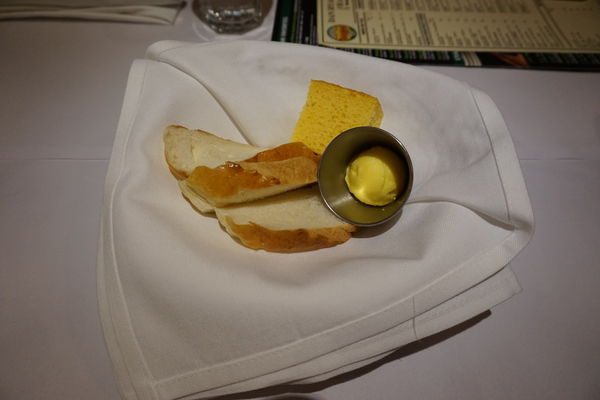 兩種餐前麵包分別是方塊型玉米麵包和切片法式軟麵包,