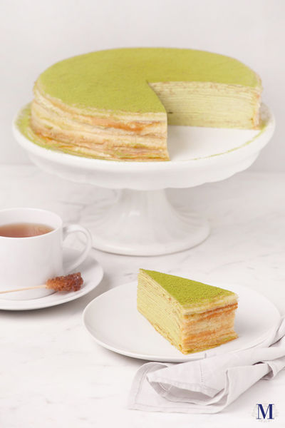 手工法式薄餅層層疊中的是抹茶鮮奶油回甘帶點苦味的滋味~