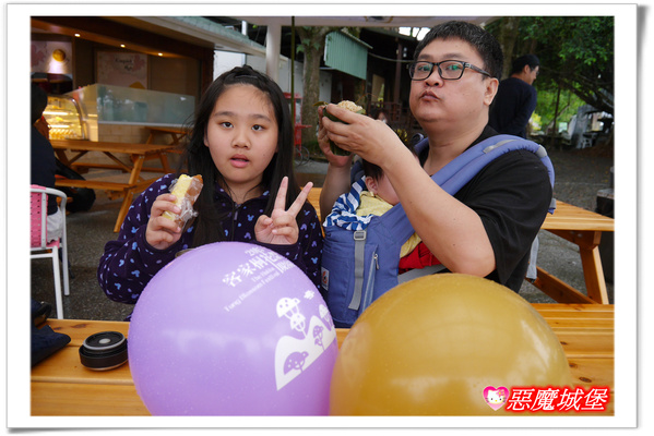 在美食攤位買了起司條跟客家粽,到休憩區休息一下加填填肚子,呵呵!