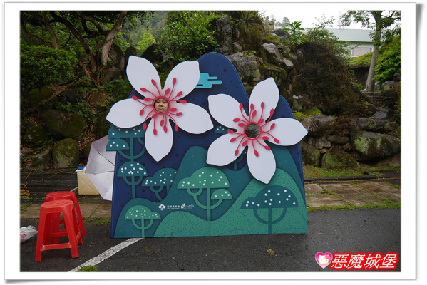 遊戲區旁邊有設立一個桐花拍照板,Fiona不太想拍,所以給我擺張臭臉,小孩大了真的比較難使喚了......