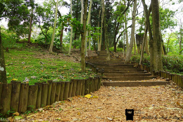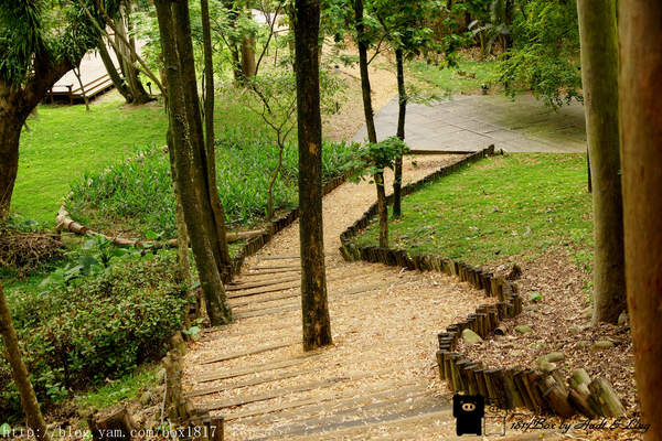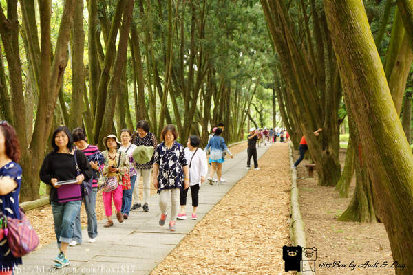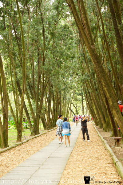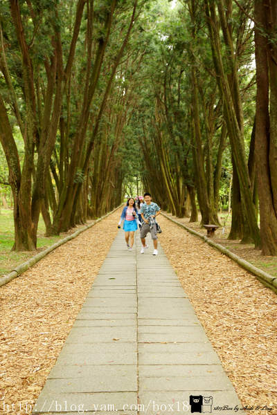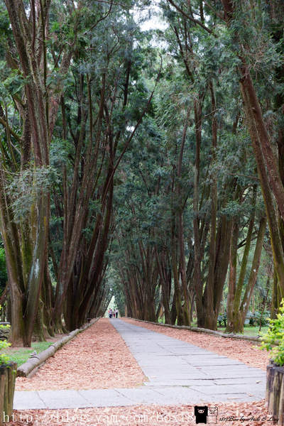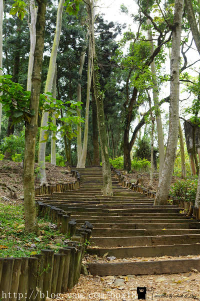 往斜坡上前進登上枕木階梯後,景色更是令人感到寧靜幽雅,一條筆直的肖楠步道呈現在眼前,