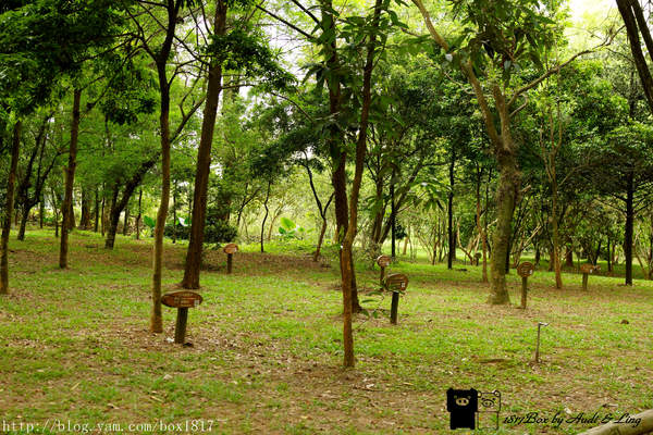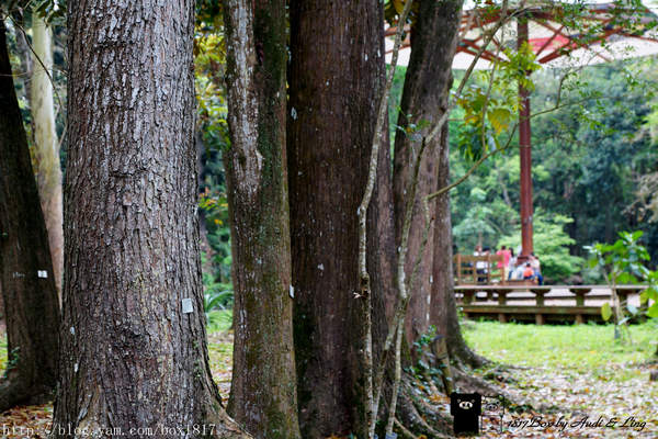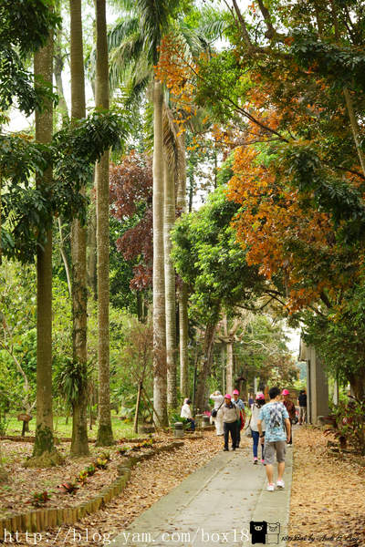 一進園區大門,一條筆直的林木大道直通盡頭,中有叉道通往丘坡,兩旁林木排闥,樹種繁多,許多是台灣不常見的樹種,如爪哇鳳果、第倫桃、蘇氏玉蘭、流蘇、藍花楹、白檀、臙脂樹,還有不同種類橄欖樹等,所有樹木均有樹名、產地、科別、特性、用途之完善標識,林木散放清芳,園區寧靜幽雅,散步其間,使人感覺塵慮盡消。