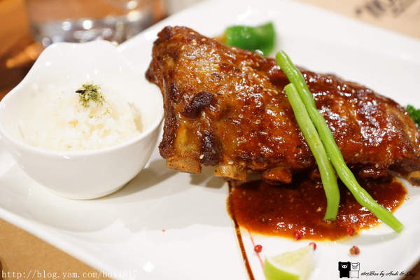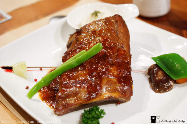 新鮮特級豬肋排約5-6根骨,以天然香料醃製48小時,先蒸後烤的多重工法,豐富出豬肋排多層次的口感,搭配主廚特調醬汁,讓豬肋排口味更加獨特。