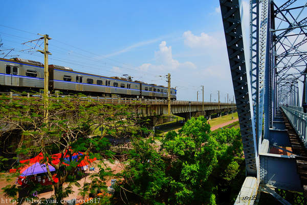 火車從新的鐵道經過,與舊鐵橋相映成趣,