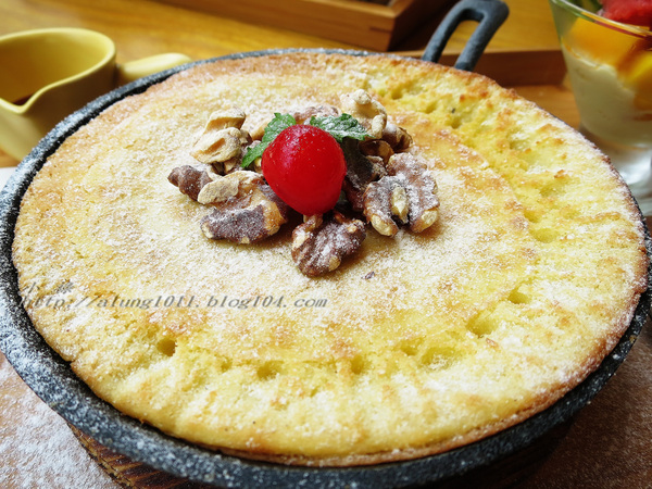 楓糖核桃熱鍋鬆餅:是店家的創意招牌甜點,口感還真的滿特別的:上層有烤蛋糕的奶蛋香、