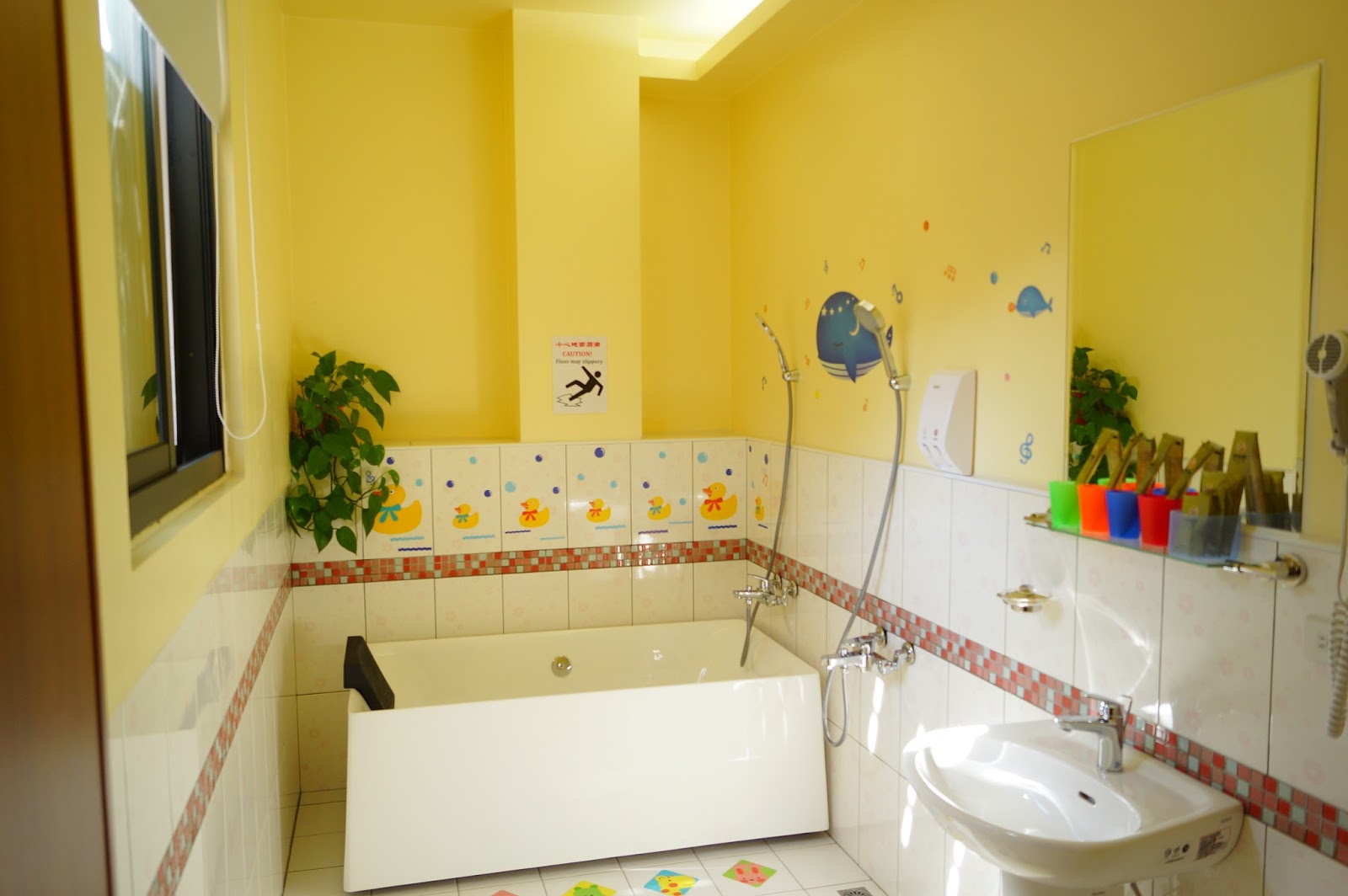 親子房的浴室也很繽紛,還有一個浴缸讓家長可以方便的幫小朋友洗澡。