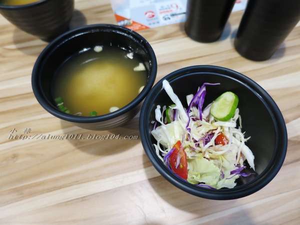 生菜沙拉與味噌湯放在開放架上面~ 架內餐具自助取用。