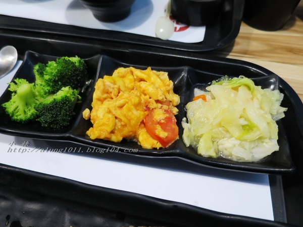 三樣小菜是熱炒鮮蔬有青花菜、蕃茄炒蛋、高麗菜。