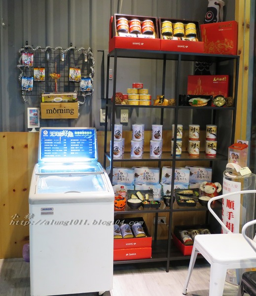 順便看看店家櫃台前賣的商品,有各式規格包裝的魚鬆除了禮盒裝外還有罐頭與零嘴包($14)
