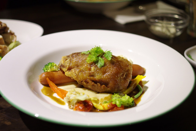 爐烤豬蹄肉捲、煙燻脆腸佐肉汁 500元