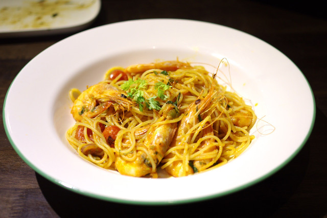 香料蕃茄七隻蝦義大利麵 360元