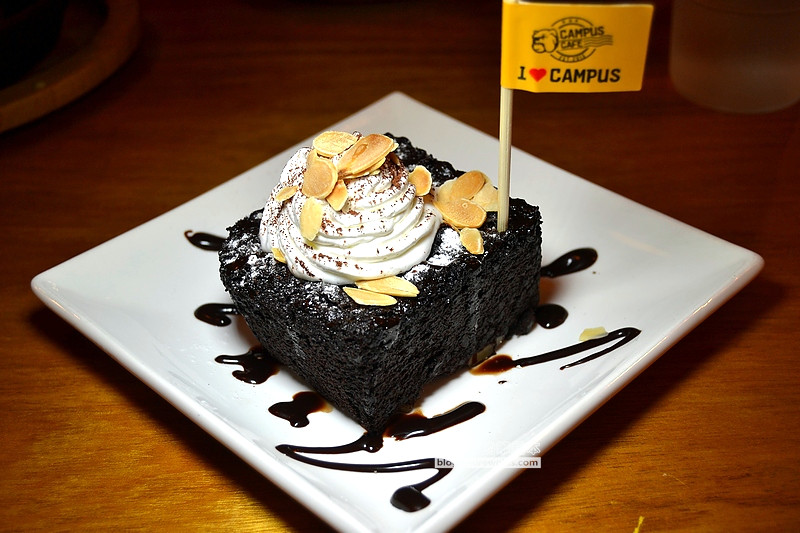 一上桌就聞濃濃可可味,上層有杏仁片,下層則有核桃,蛋糕本身算是比較鬆軟的口感,使用打發鮮奶做搭配,感覺很像在韓國吃到那種水水的奶油,吃起來較不會有油膩感,此外布朗尼一上桌的時候是熱熱的,連奶油也都是溫熱的!布朗尼就是要吃熱的才好吃啊!