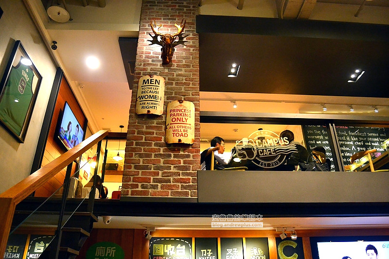 挑高的餐廳空間沒有壓迫感,一貫的學院美式風格裝潢設計是Campus Cafe的特色,店內有不少台大螢幕電視以及投影布幕,營造出很休閒的氣氛