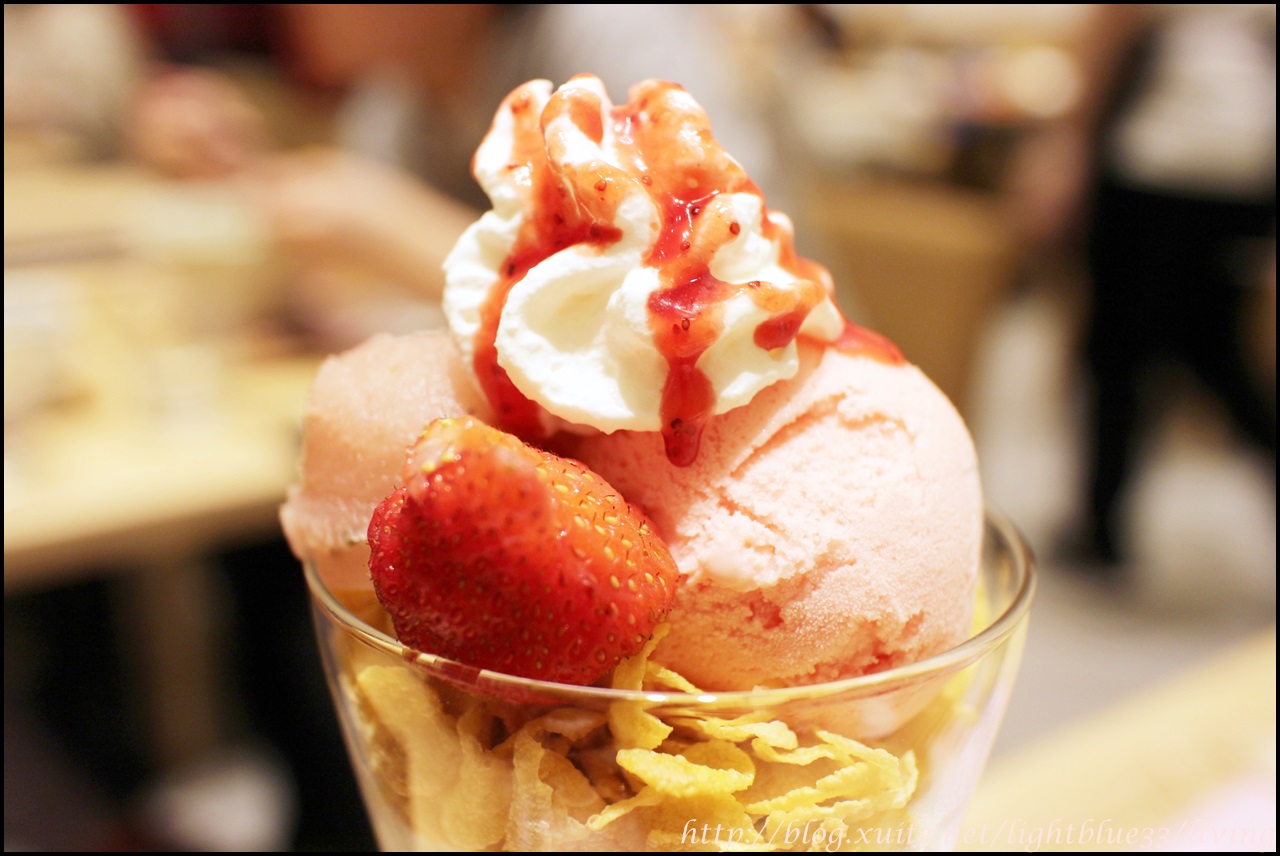 鮮奶油上頭的草莓醬酸甜夠滋味,玉米片也是印象中薄脆的那種,口感好。草莓冰淇淋味道強烈,有點偏甜