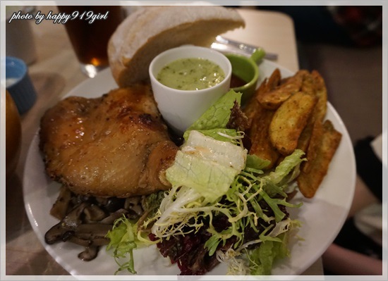 以手作麵包、野菜沙拉、薯塊及杯湯搭配義式香料雞腿的套餐,看起來份量十足
