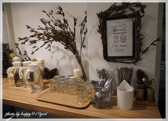 "I'm Here"的可愛立牌是告訴客人紙巾、餐具、水和杯子皆請自取